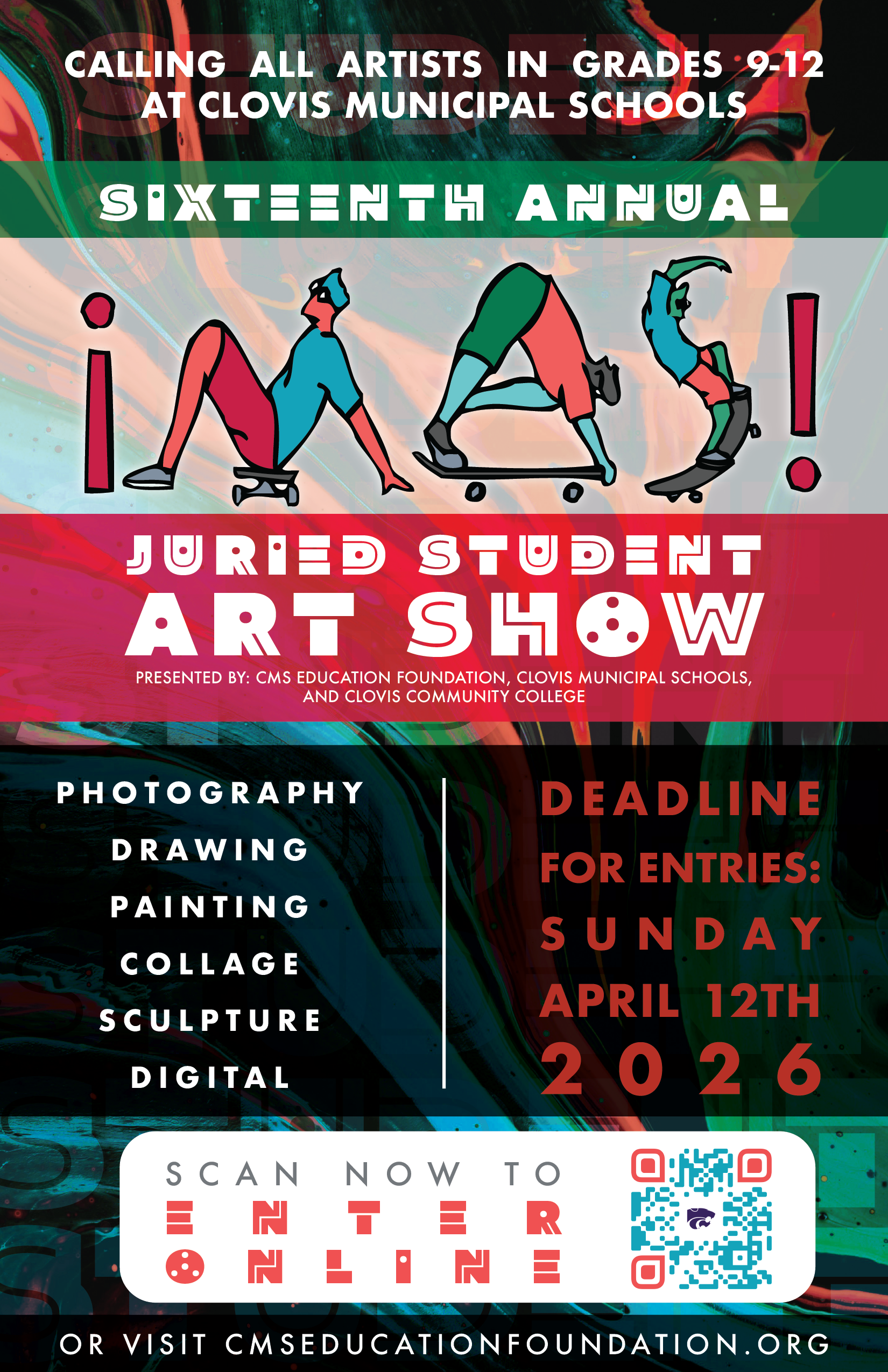 The CMS Education Foundation is proud to present the annual ¡Más! Juried Student Art Show, showcasing the talent and creativity of Clovis High School and CHS Freshman Academy students. The extended deadline for entries is Sunday, April 12, 2026 at midnight, so don’t miss your chance to be part of this vibrant celebration of student art.